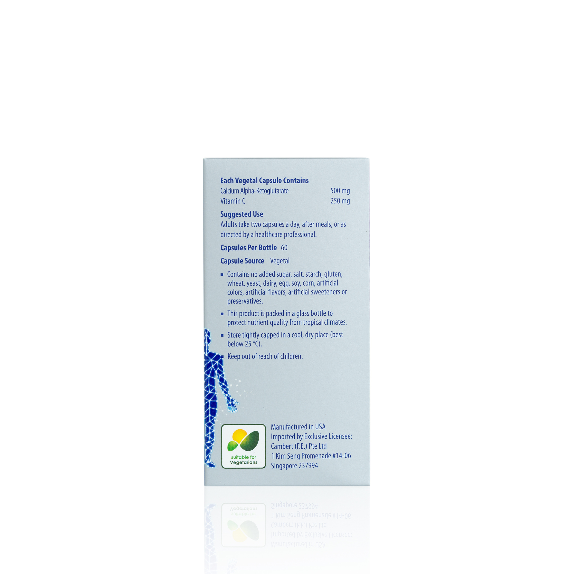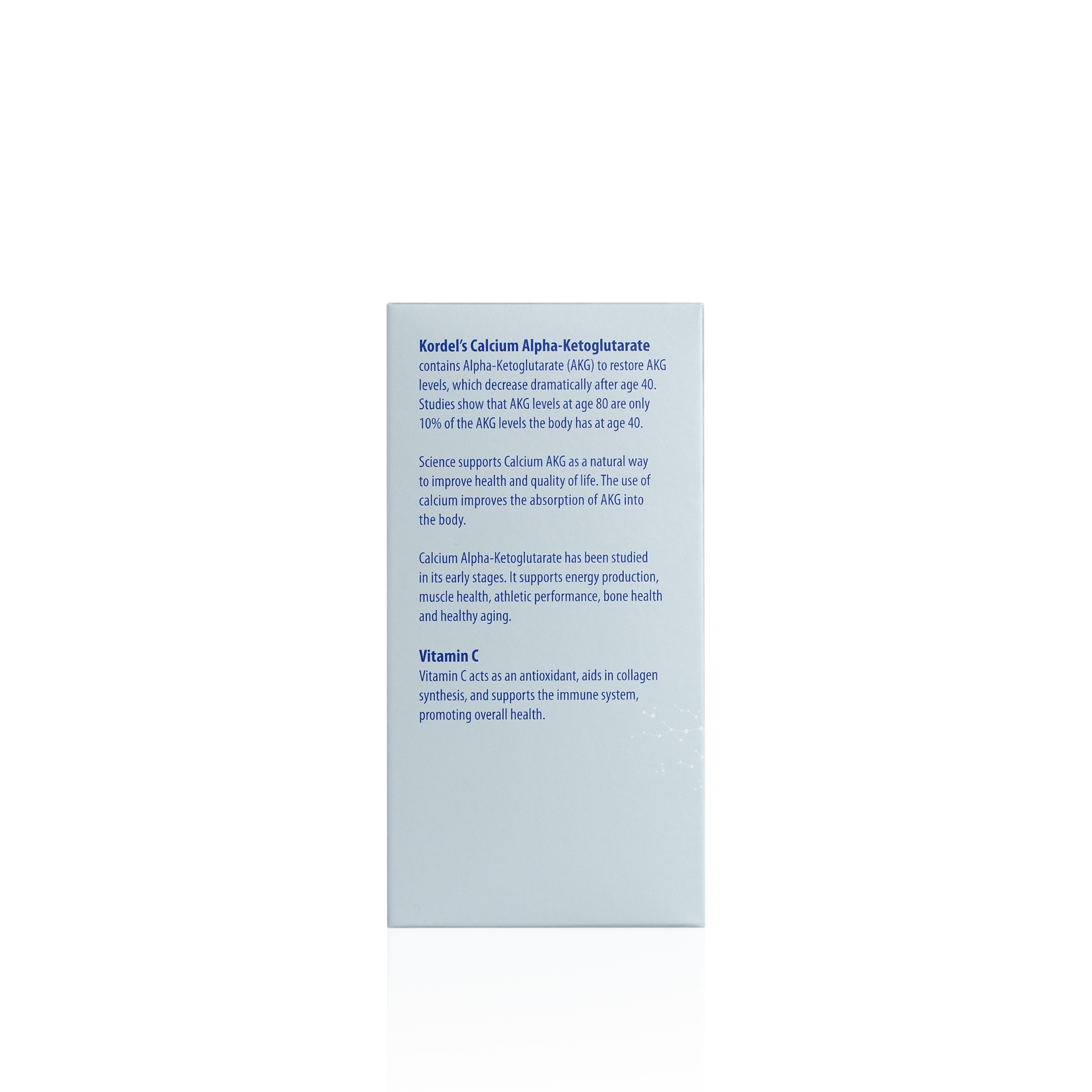 Contains Alpha-Ketoglutarate (AKG) to restore AKG levels, which decrease dramatically after age 40. Studies show that AKG levels at age 80 are only 10% of the AKG levels the body has at age 40. Science supports Calcium AKG as a natural way to improve health and quality of life. The use of calcium improves the absorption of AKG into the body.Calcium Alpha-Ketoglutarate has been studied in its early stages.
