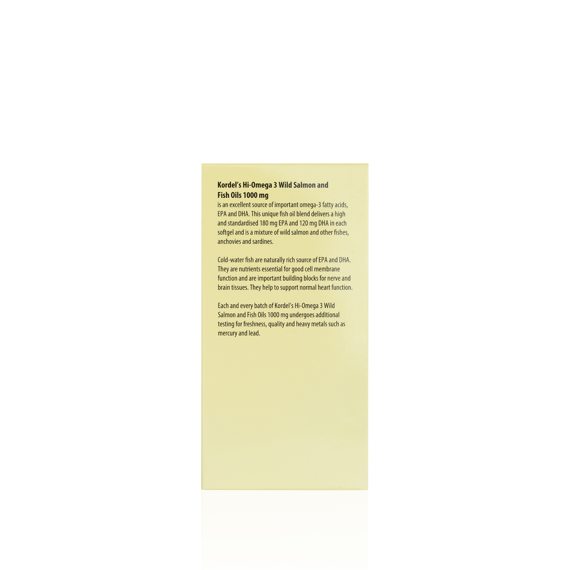 Each and every batch of Kordel’s Hi-Omega 3 Wild Salmon Fish Oil 1000 mg undergoes additional testing for freshness, quality and heavy metals such as mercury and lead.